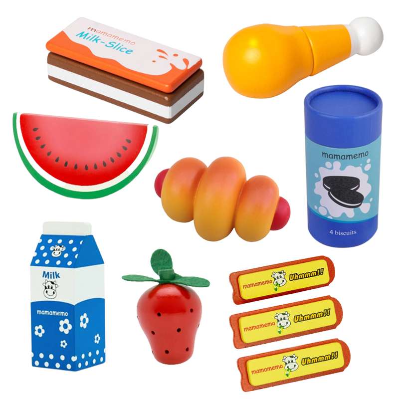 I takt med at barnet får forskellige fødevarer af træ at lege med, kan beholdningen udvides med løst tilbehør. Den store fordel ved træmaden er, at både små og store børn kan lege med.