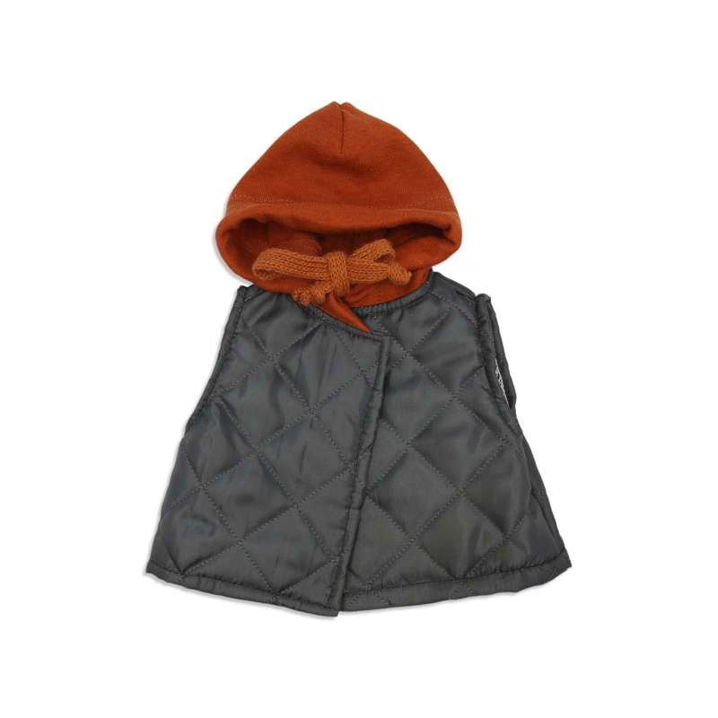 Vesten er håndlavet i mørkegråt polyesterquilt og har en påsyet, rustfarvet jerseyhætte. Det nordiske vejr...