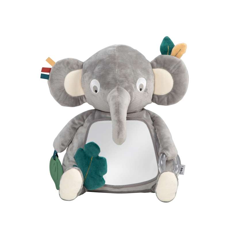 Finley the elephant har et stort babysikkert spejl på maven, og holder en rangle i den ene hånd og en teether, der er perfekt til ømme gummer, i den anden hånd.