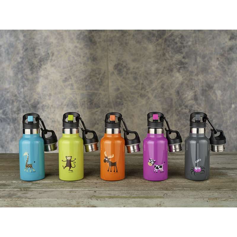 Termoflasken kommer med to forskellige låg - ét skruelåg i rustfrit stål, samt et låg med et sugerør, der kan vippes op. Det gør flasken mere børnevenlig end mange andre drikkeflasker på markedet, da den er let at drikke af for de allermindste.