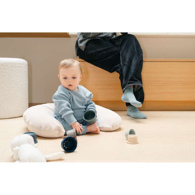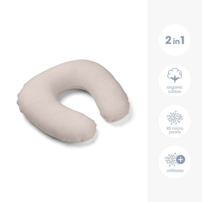 Den runde Doomoo-ammepude giver muligheden for at sidde godt rundt om mors mave. Puden er fyldt med små EPS-kugler, der dannes efter mor og baby's krop. Det er blødt og behageligt og bevarer sin fylde gennem amning uden at synke sammen. På denne måde mister babyen ikke grebet om brystvorten og får en optimal ammeposition.