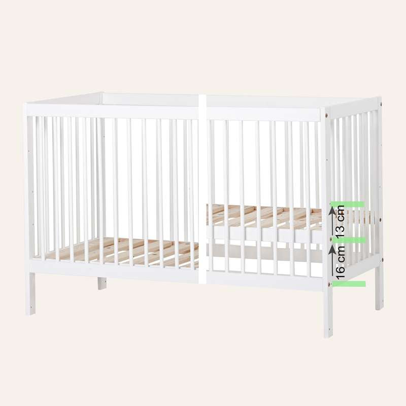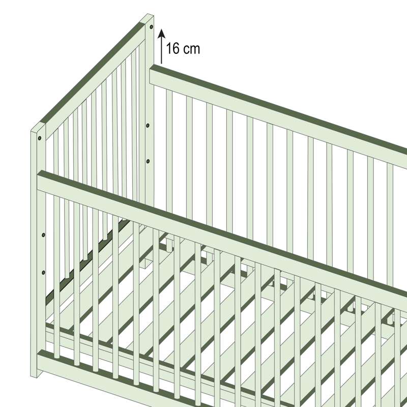 • 16 cm over gulvet – brug denne indstilling, når dit barn kan stå, så de er sikre i tremmesengen.