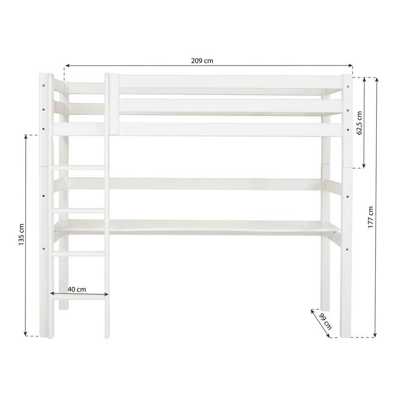 Smart ECO Luxury højseng i størrelse 90x200 cm med bordplade fra Hoppekids. Bordpladen, og den gode højde på hele 135 cm under sengen, gør det nemt at indrette en praktisk og hyggelig arbejdsplads. Sengen er svanemærket, har livstidsgaranti og er overfladebehandlet med miljøvenlig, vandbaseret lak.