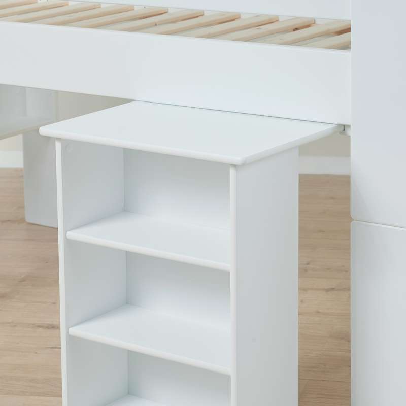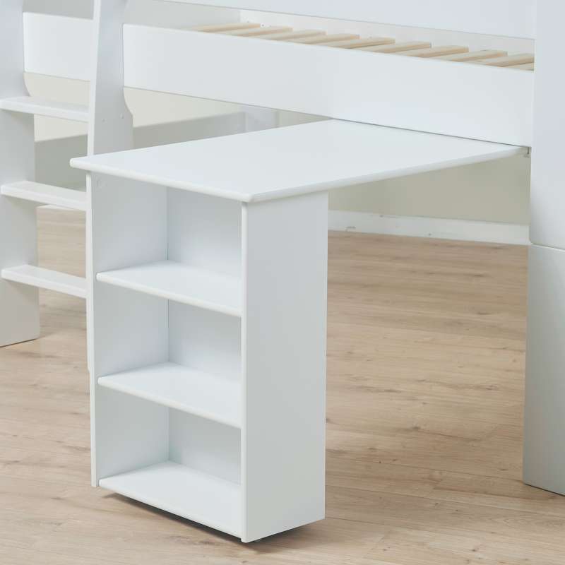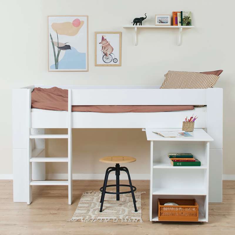 Hoppekids PURE-skrivebordet er designet med både funktionalitet og fleksibilitet i tankerne og er en smart pladsbesparende løsning. Placeret under halvhøjsengen udnytter det rummets højde effektivt og frigør gulvplads til leg eller opbevaring. Skrivebordet har et brugervenligt udtrækssystem med glat integrerede hjul, der gør det nemt at glide ind og ud under sengen.