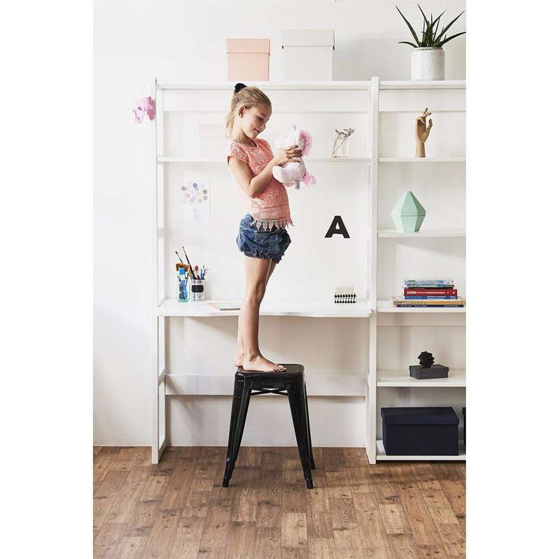 Denne smarte reol fra STOREY opbevaringssystem fra Hoppekids giver dig både arbejdsplads, 80 cm bred, og massere af opbevaring. Overfladen er behandlet med miljøvenligt, vandbaseret lak.