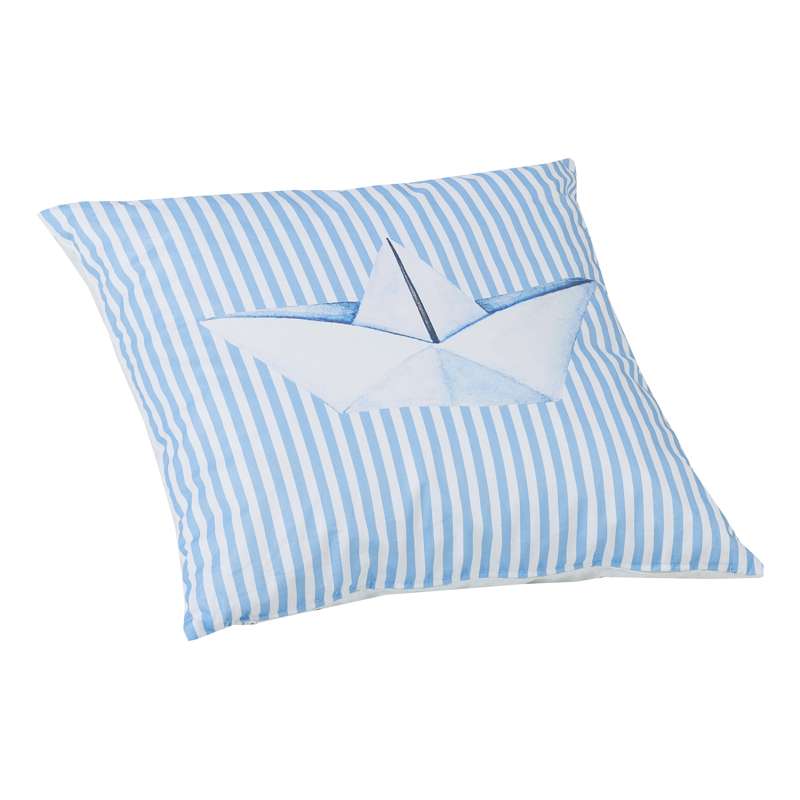 Den, bløde pude fra universet Tin Soldier har det fineste stribede print med en papirs båd. Puden er 50 x 15x 50 cm, og er den perfekte pyntepude til børneværelset.
