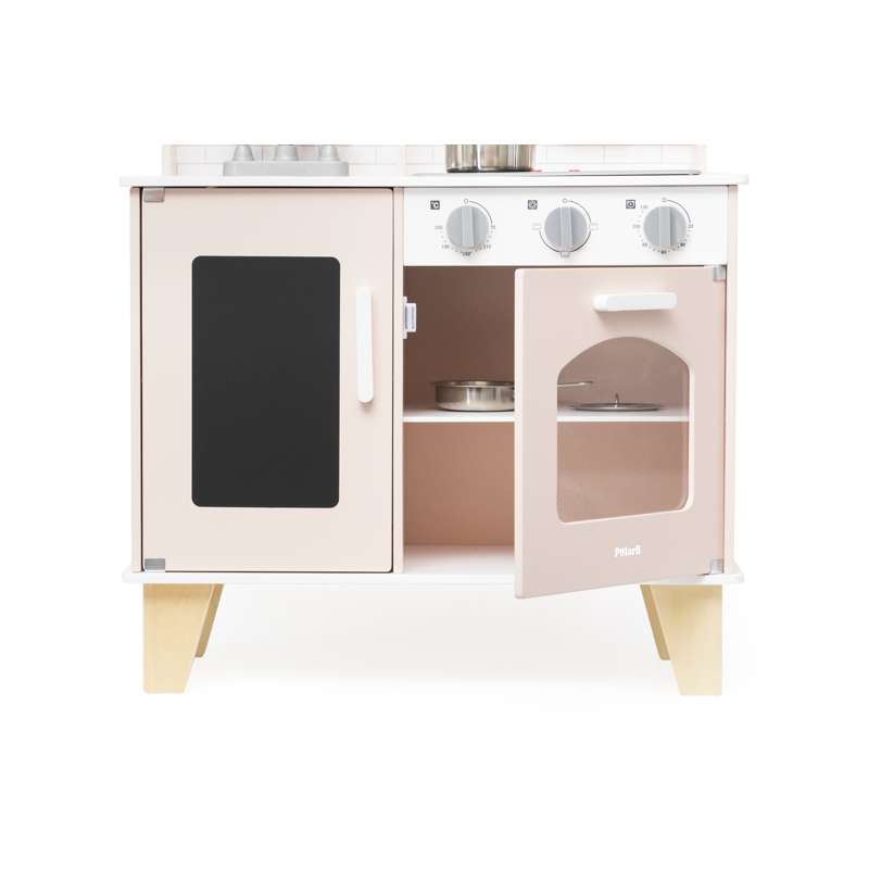 Med realistiske detaljer som kogeplade med lys og lyd, drejeknapper og ovnlåge, får barnet en leg, der både engagerer og inspirerer. Den medfølgende kridttavle er perfekt til at skrive dagens menu eller små beskeder, mens tilbehøret – gryder, skeer, krydderibøsser og meget mere – gør legen komplet fra første dag.