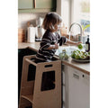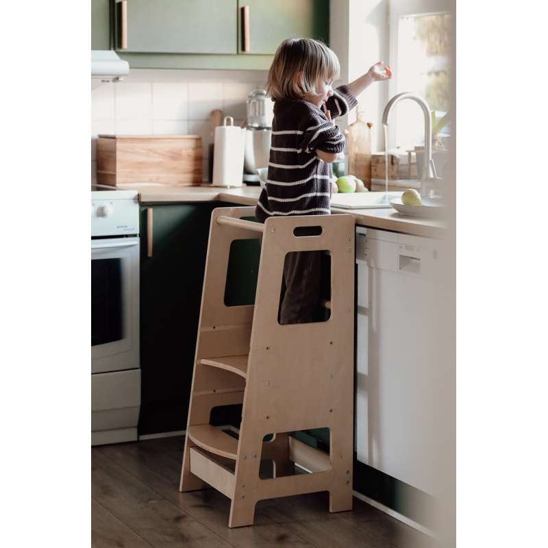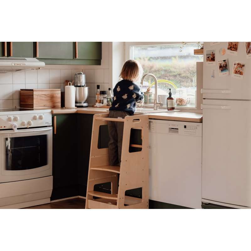 Et læringstårn der let flytbart, så barnet også selv kan vælge at være med i køkkenet eller andre aktiviteter i voksenhøjde.