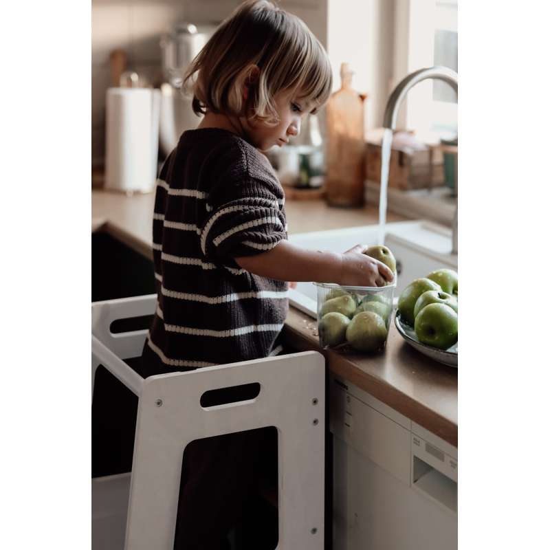 Kid'oh Læringstårn i træ i hvid er et multifunktionelt møbel, designet til at give børn en sikker platform til at deltage i daglige aktiviteter i køkkenet. Læringstårnet er lavet af solidt træ og kan justeres i højden for at følge med barnets udvikling. Det er ideelt til at fremme børns selvstændighed og motoriske færdigheder, da det giver dem mulighed for at deltage i aktiviteter som madlavning eller håndvask. Et stilrent og praktisk valg til ethvert hjem med småbørn.