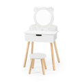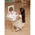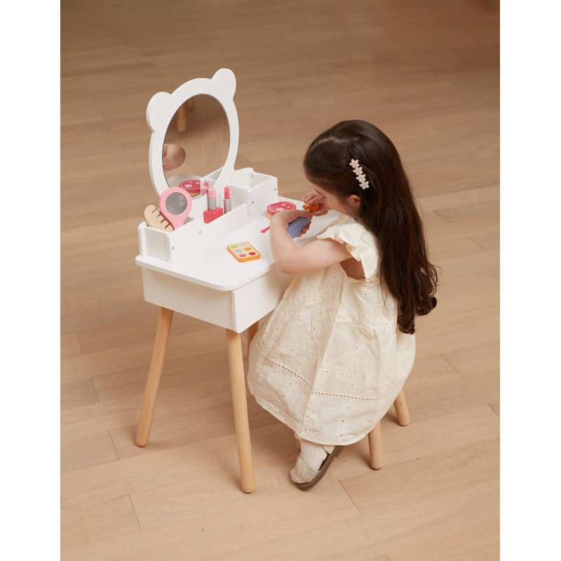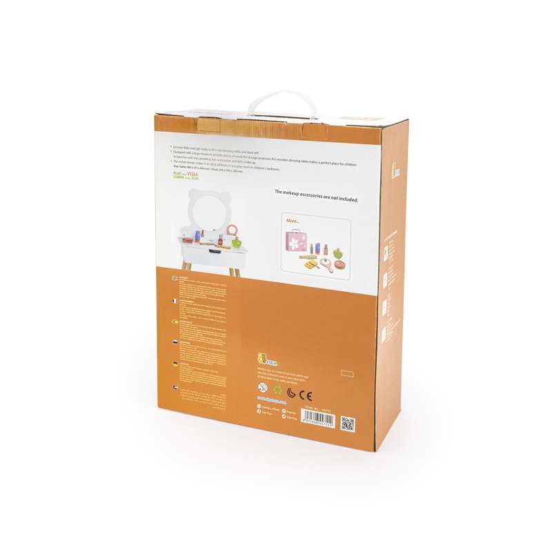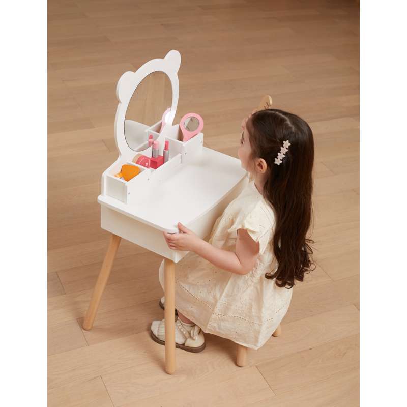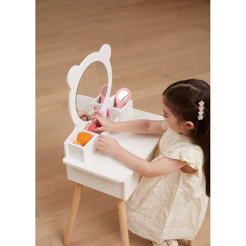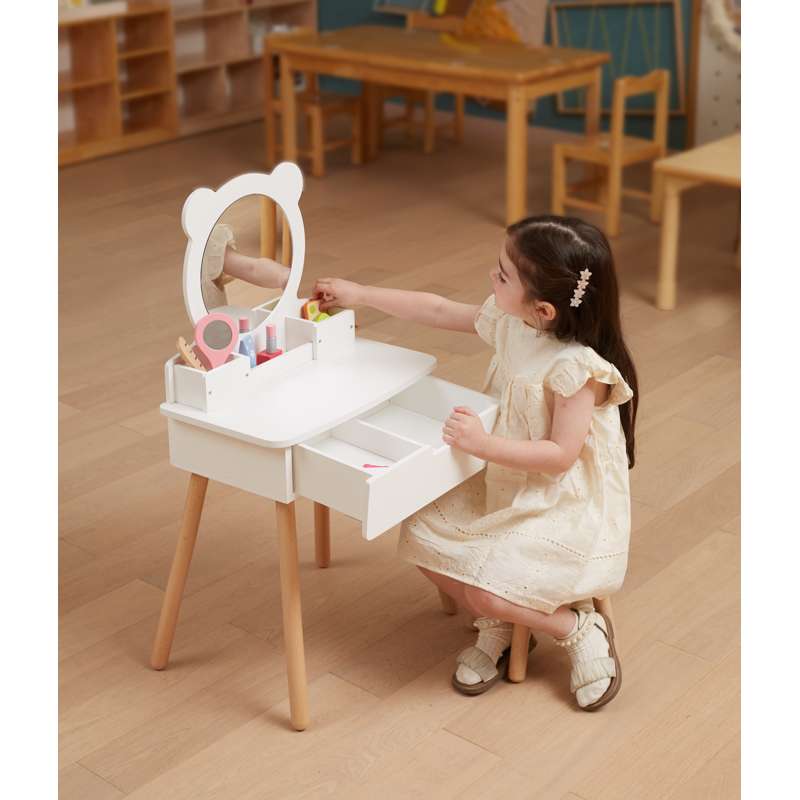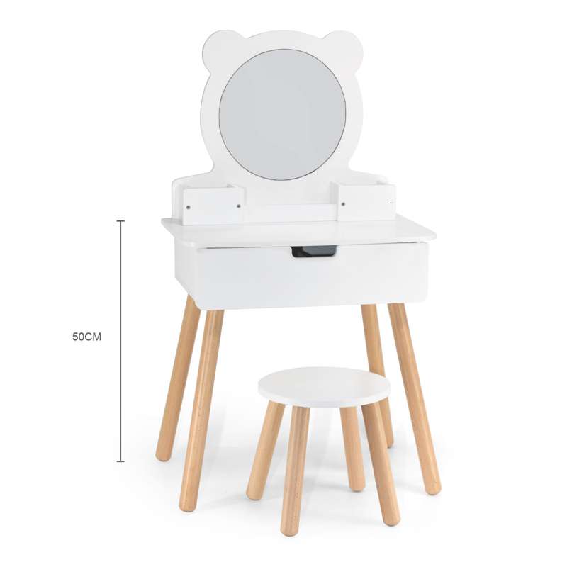 Lad dit barn gøre sig klar ved dette charmerende sminkebord med tilhørende skammel – perfekt til små prinsesser og stylister i udvikling! Det solide træbord er udstyret med en stor og rummelig skuffe, der giver masser af opbevaringsplads til legetøj, smykker, hårpynt og børnemakeup. Her kan barnet udfolde sig kreativt og lege sig ind i rollen som frisør, stylist eller stjerne foran spejlet. Det elegante og tidløse design gør bordet til en smuk tilføjelse i ethvert børneværelse eller legehjørne, hvor det både pynter og inspirerer til rolleleg og selvudfoldelse.