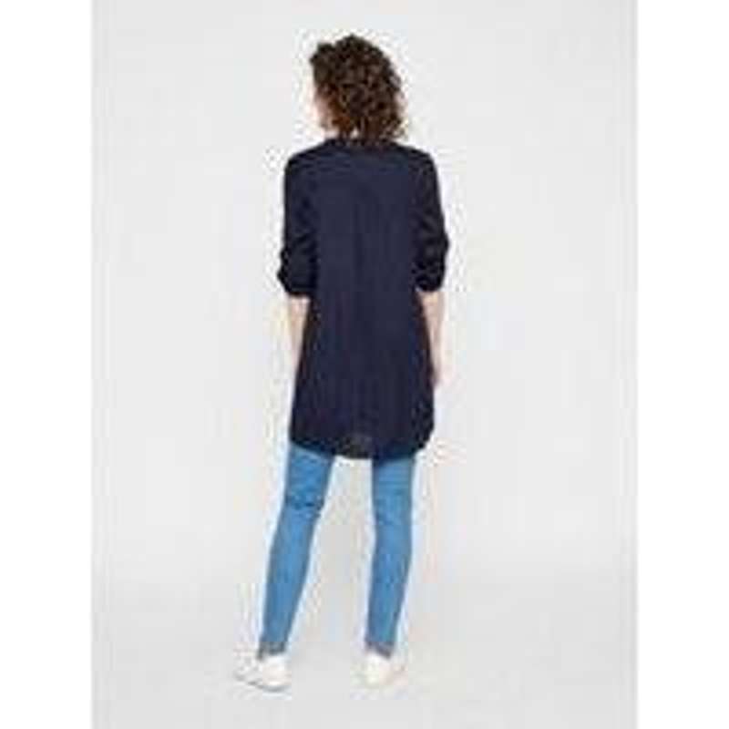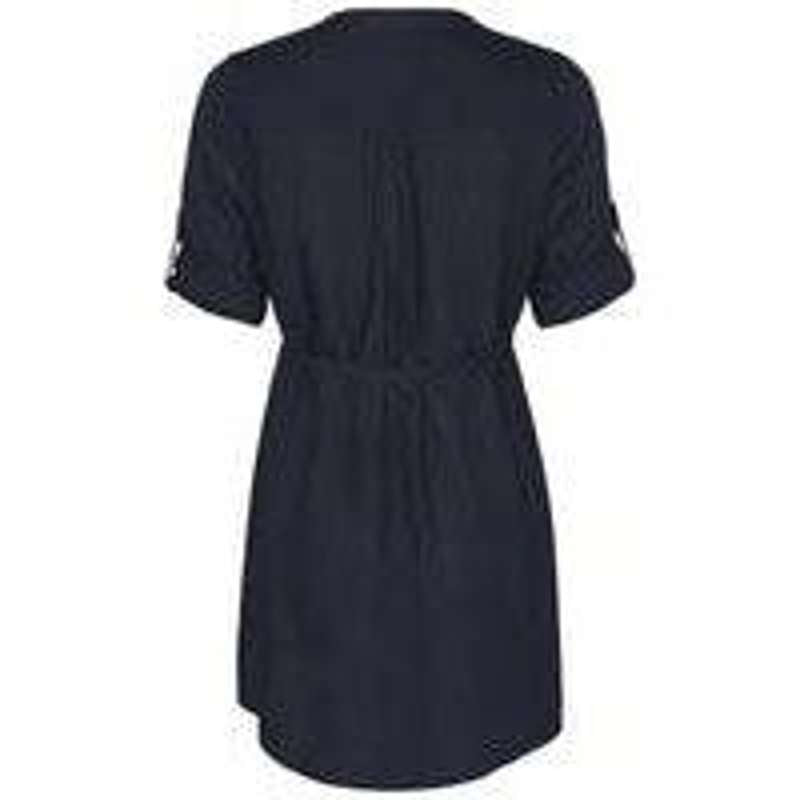 Tunikaen har bindebånd i taljen og stropdetalje med knaplukning ved ærmerne.