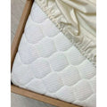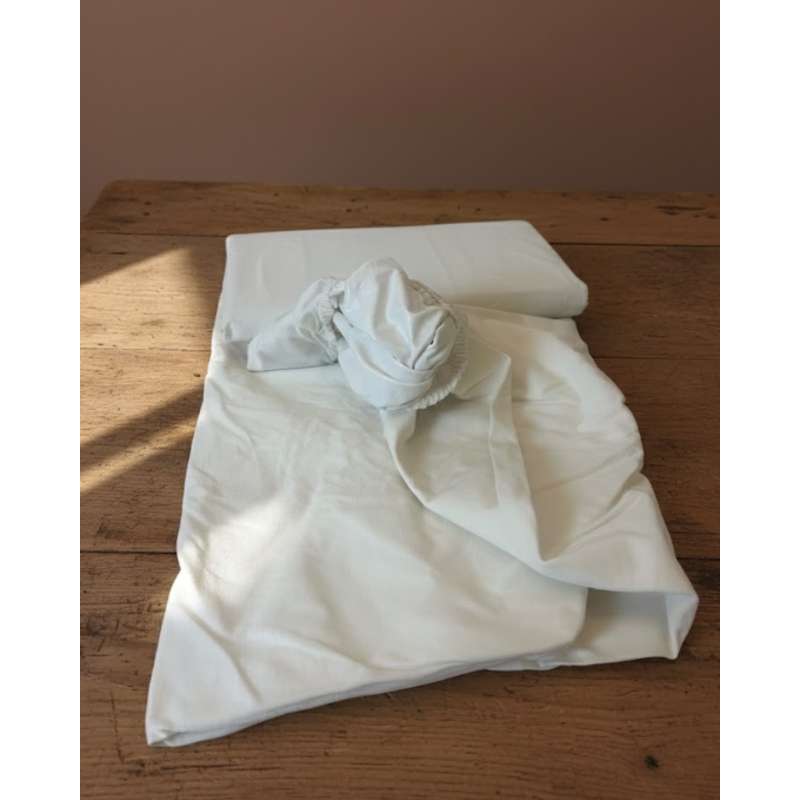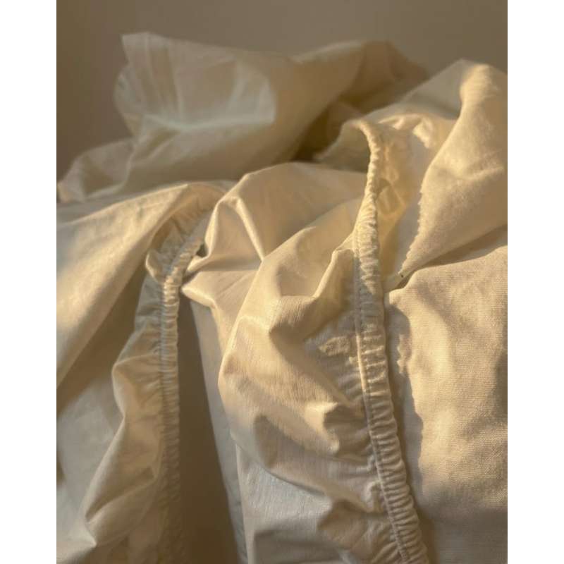 Den vandtætte PU-membran på bagsiden forhindrer fugt i at trænge igennem til madrassen. Lagnet har en knækket hvid/lys creme farve, som giver et roligt og neutralt udtryk i børneværelset.